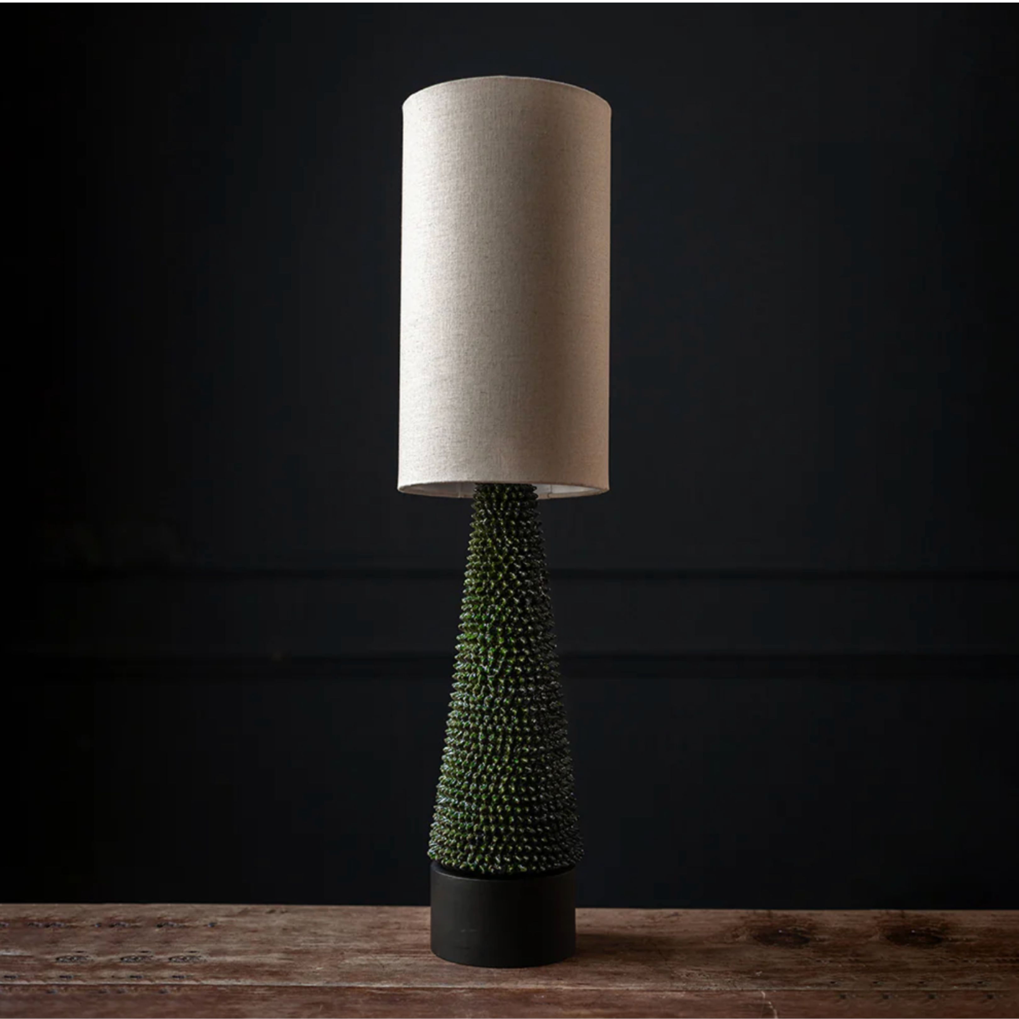 Cuerpo en barro con esmalte vidriado y pantalla en tela